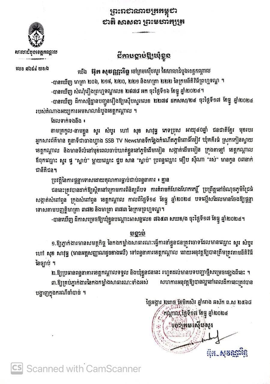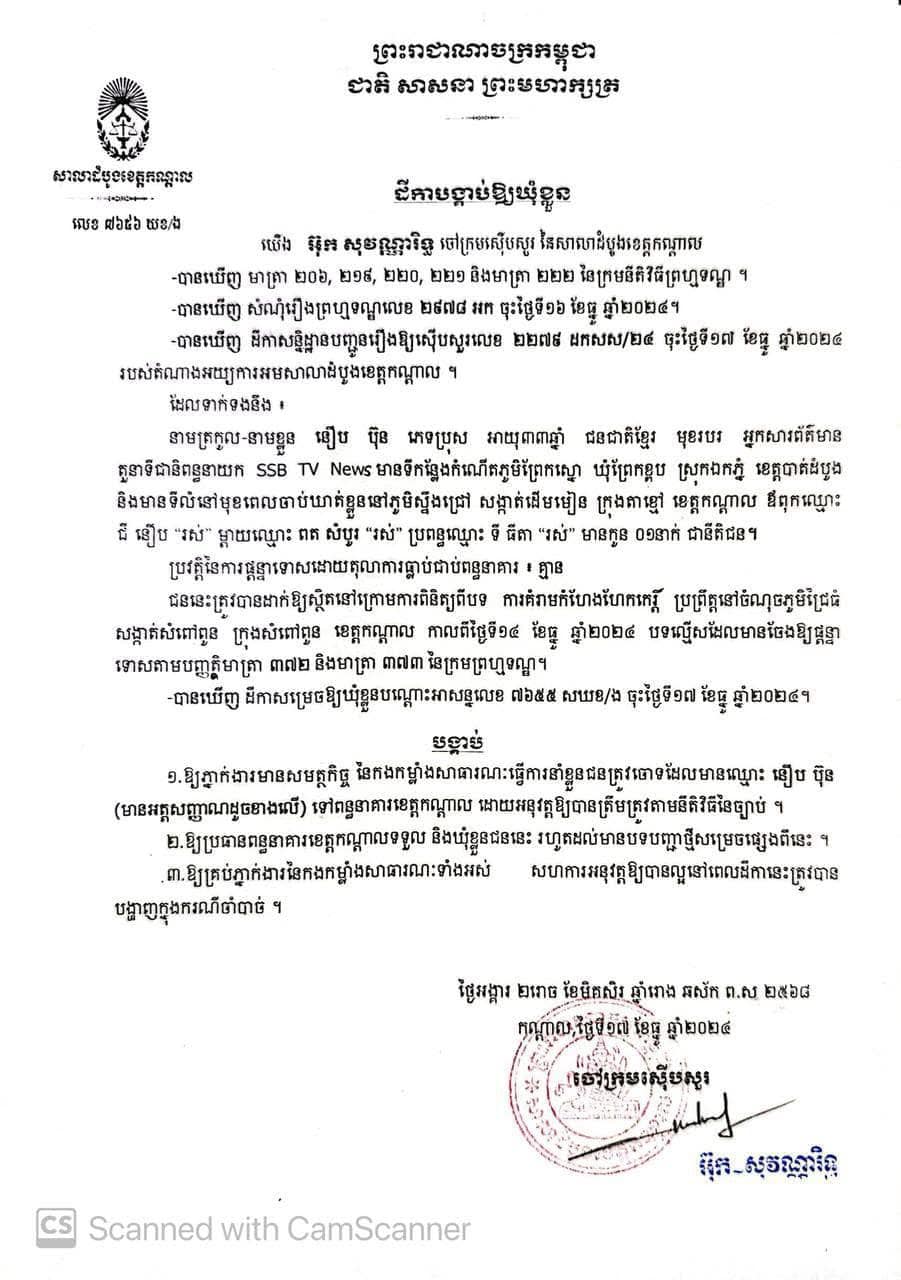 Two online journalists from SSB TV News were charged with blackmail under Article 372, 373 of Criminal Code by the Kandal provincial court and sent to pre-trial detention at Kandal provincial prison on December 17, 2024.
