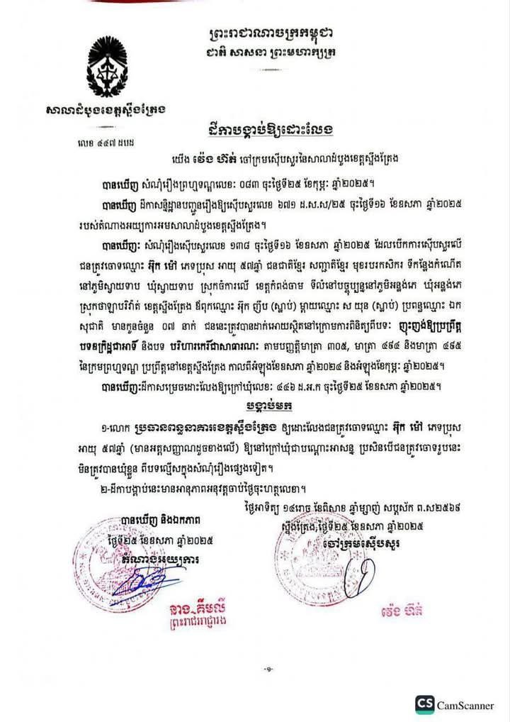 Stung Treng Province – Environmental journalist Uk Mao was released on bail on May 25, 2025, according to the release order issued by the investigating judge of the Stung Treng Provincial Court .